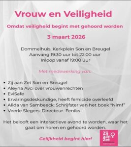 Vrouw en veiligheid In het kader van de Internationale Vrouwendag organiseert de lokale politieke partij Zij aan Zet in Son en Breugel op 3 maart een avond met als thema Vrouw en Veiligheid. Onder andere Alida zal een lezing geven met als thema: ‘De kracht van verhalen bij herstel van Huiselijk geweld.’ Ook zullen haar